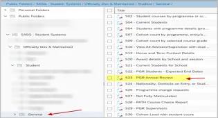 Administrators with access to student reporting in BI Suite will be able to create an export of all annual review data for their School or Programme. From MyEd, select 'Reporting and analytics' and click the BI Launch Pad button. Select 'Folders' Navigate through the following folders:Public FoldersSASG: Student SystemsOfficially Dev & MaintainedStudentGeneralSelect the report 'S23 - PGR Annual Review' and follow the prompts to run the report. If you require assistance running student reports in BI Suite, please contact the Student Analytics, Insights and Modelling team. https://uoe.sharepoint.com/sites/StudentAnalytics/SitePages/Operational-Reporting.aspx This article was published on 2025-05-08