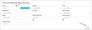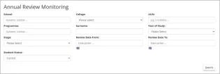 Administrators with PGR permissions in EUCLID can use the Annual Review Monitoring tool to monitor the progress of annual reviews in their School or programme. From EUCLID Students, select Annual Review Monitoring. ANNUAL REVIEW MONITORING The tool will enable you to view all annual reviews for your School. Additionally, you will be able to refine your search using the prompts. For example, complete the School field and select ‘Search’ to display all active annual reviews in your School. This may take a few moments. The search results will display a list of all annual reviews still in progress and you can use the toggles at the top of each column to sort them. For example, click the ‘Outcome’ toggle to display all annual reviews that have had an outcome recorded by the Principal Supervisor. The Outcome column will display whether the Principal Supervisor has confirmed progression. It will also display they have recommended that a repeat annual review should be taken. If the Outcome column is blank, it means that the review has not yet progressed beyond the Student stage. Administrators can add notes to the Notes field. These notes do not display anywhere in the annual review. This article was published on 2025-05-08