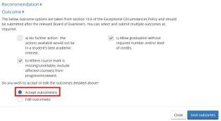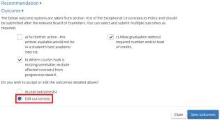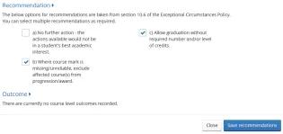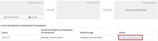 Guidance on how to search for students with Exceptional Circumstances and how to record outcomes at course-level in Assessment Hub. Overview All assessments where a exceptional circumstance has been validated by the Exceptional Circumstances (EC) team requires an outcome decision, which is recorded in the Assessment Hub.Assessment/component/item level decisions are applied to each individual assessment/component/item where a student has an EC. Please see the bottom of this page for the guidance link.Once an assessment-level decision has been recorded, you may need to also record a course-level decision for the overall course result, when the EC has potential impact on the student's progression outcome or award outcome. Making course-level outcome decisions A course-level EC outcome decision is considered as a requirement of the Progression and Awards Board. The available decisions of listed in Section 10.6 of the Exceptional Circumstances Policy.View the Exceptional Circumstances PolicyThe case link for each assessment will be displayed in Assessment Hub. Staff who have access to the Assessment Support Tool can open the links to view the case details.The below flowchart demonstrates the overall process of making EC outcome decisions. Recommended outcome and final outcome There are two levels of outcome decisions to be made for each course with an EC.Recommended outcomePre-Board Committee makes decision on the recommended outcome and records it in Assessment Hub, before the Board meets to decide on the final outcome.The recommended outcome will not be displayed to the student at any point.Final outcomeThe Board makes decision on the final outcome by either agreeing with the recommended outcome or changing it.The final outcome will be displayed to the student after the course result has been published.The reason of seperating the recommended outcome and final outcome is to support the different Committee and Board level decision-making processes. However, a recommended and a final outcome decision can be made at the same time if it is more suited to the individual School's process.Selecting and saving a final outcome does not affect the course mark. For the outcome to be taken into consideration, the overall course mark has to be ratified and published. Recording course-level outcome decisions Search for students with Exceptional Circumstances Open EUCLID, and go to "Students" tab > "Assessment and Progression" section > "Assessment Hub" option. 2. Enter the Course Code, select the Academy Year, and slick Search. 3. Click the “Process course results” button. 4. Use the filter options to find students with Exceptional Circumstances. 5. Click the i button to open the screen for the student. 6. Cased links are displayed at assessment/component/item level and at course level.Staff who have access to the Assessment Support Tool will be able to open the links to view the case details. Provide a recommended outcome Beneath the course result fields, click “Provide recommendation”. 2. Select the recommended outcome(s), and click “Save recommendations”. Once saved, the outcome decision status will change from “Provide recommendation” to “Provide outcome”.The recommended outcomes are visible to other staff in your School who have access to Assessment Hub, and will be displayed on BI reports for EC.They are not visible to students at any point. Provide a final outcome Beneath the course result fields, click “Provide recommendation”. 2. The screen is pre-populated with the recommended outcomes recorded in the previous step. 3. If you wish to accept the currently selected outcome, select the “Accept outcome(s)” option, and “Save outcomes”. 4. If you wish to change to other outcomes, select the “Edit outcome(s)” option, select the new outcomes, and “Save outcomes”. Viewing the final outcome Staff view After the final outcome has been provided, it will be visible to staff in:Assessment HubBI reports for ECThe EC case's details in the Assessment Support Tool Student view After the final outcome has been provided and the overall course result has been published, the final outcome will be visible to students in student-friendly wording in:Student Self-service portalStudent view of their EC case details in the Assessment Support Tool Multiple EC cases for one course Assessment Hub supports only one EC outcome for one course.If a student has multiple EC cases at the course-level, please record the latest EC outcome in Assessment Hub. If a previous EC outcome has already been recorded, you will need to edit it to the latest EC outcome.You can keep track of the previous EC outcome by adding it to the Course Note textbox.Students cannot see the previous EC outcome on their self-service, therefore the School needs to communicate it to the students via other means. Related pages Recording Exceptional Circumstances outcomes at assessment-levelRatifying course resultsPublishing course resultsChanging marksMaking changes following Exceptional Circumstances outcomesProgression & Awards process overviewExceptional Circumstances Policy This article was published on 2025-05-07